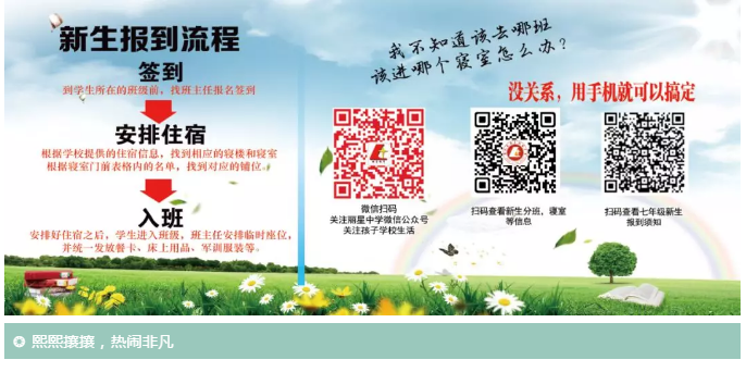 今天开学啦,绝大多数同学对这座校园非常陌生,虽然校园个别项目正在建设中,但仍不失她美丽的内涵,为了使同学们及陪伴报道的家长朋友们能够顺利的完成第一天的入学流程,校委会及七年级全体教师做了详尽的安排和准备! 今年的开学季,学校利用网站便利,将各种信息提前公布,家长只需用一部手机扫描二维码就可以查阅新生入校的各种信息。